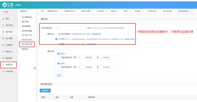 ①敏感词库—根据自定义敏感词所需进行设置,并且针对员工沟通中触发的敏感词做通知(目前通知短信或邮箱方式)