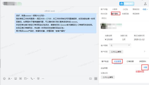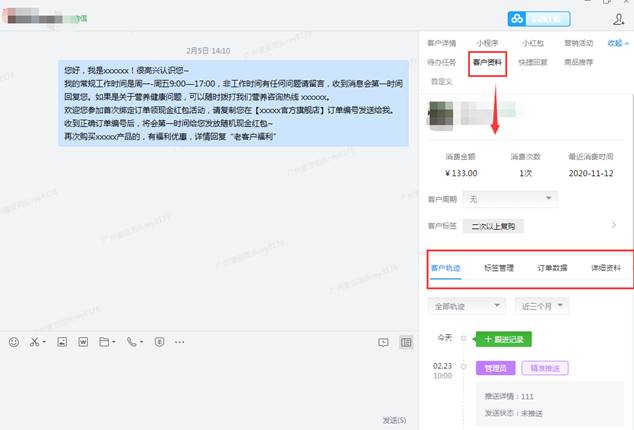 主要用于展示好友拓展信息内容,电商数据和互动信息展示对应数据,系统自动获取客户信息(如:客户最近一次的购买时间、客户最近一次的聊天时间等)便于商家分析客户情况
